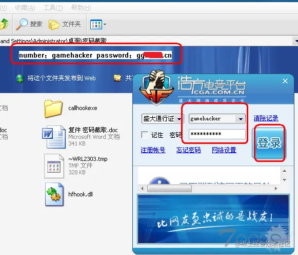 先运行CallHook.exe,然后运行XX电竞平台客户端进行登陆。在点击登陆或按回车后会在桌面的左上角打印出帐户和密码。演示如下: