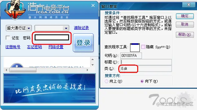 密码输入框的类名是:Edit。我们可以看到XX电竞平台登陆窗口的控件均是windows标准控件。因此采用发送WM_GETTEXT消息的方法是最简单的。
