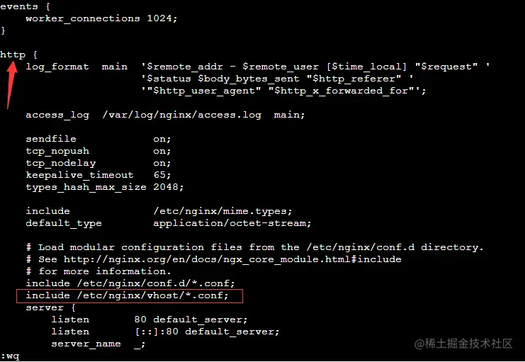 nginx.conf就是默认配置文件。但不采用直接修改 nginx 配置文件的方式,而是新建一个文件夹,将自己的配置写在新建的文件夹中。再利用