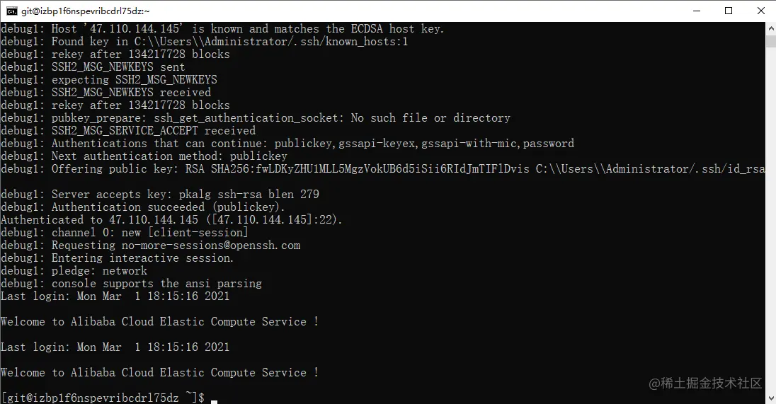 最后提示Welcome to Alibaba Cloud Elastic Compute Service !,说明不用输入密码也登录成功了,即配置 Git 密钥成功,以后更新博客部署的时候不用输入 Git 密码了!