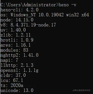 在 cmd 命令行中输入npm install hexo-cli -g,安装 hexo。完成后输入hexo -v查看版本信息,确认安装成功。