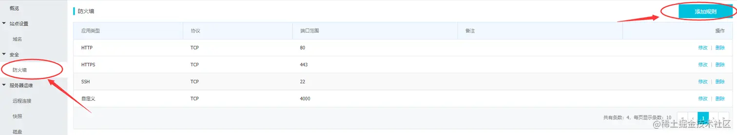 点击云服务器管理页面的防火墙,再点击添加规则。