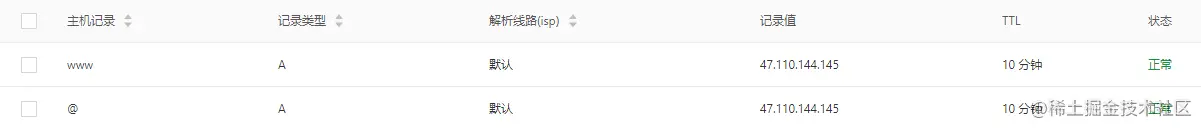 www代表域名前加www.,如www.lzxjack.top,@就代表lzxjack.top,这样两个地址都能访问到服务器了 - 记录类型