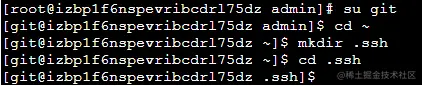 切换到 git 用户,然后在~目录下创建.ssh文件夹