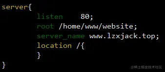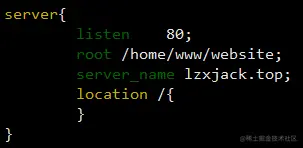 listen代表监听 80 端口。root是博客的根目录,页面存放的地址。server_name是服务器名称,填域名lzxjack.top,将域名和博客的页面根目录绑定。为了让