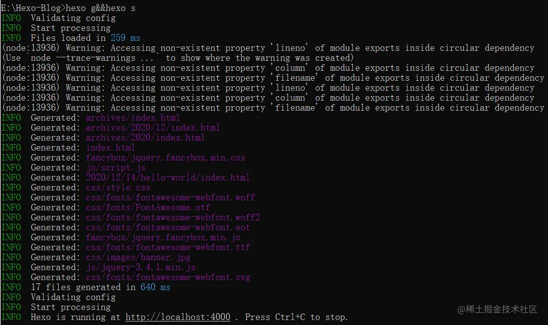 hexo g&&hexo s(生成静态文件,并开启本地服务器)根据提示,在浏览器中打开