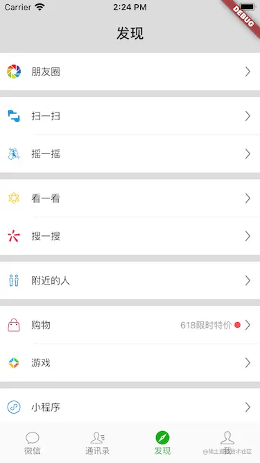 最外层使用一个Container包装一个Row,然后Row里面再包含两个Container包着的Row分别代表左右两边子视图。这样看上去应该还算蛮清晰明了的。左侧部分的图标和标题是必传参数,没啥好说的。右侧由于子标题和子图标都不一定存在,所以需要做一些处理,Text控件如果没有子标题可以显示空字符串‘’,这个比较好解决。而子图标不能说给一张空图片,所以需要根据subImageName是否为空来显示不同的控件,如果有就显示Image,如果没有就显示一个Container占位。最右侧的箭头图标是每个cell都存在的就没啥好说的了。自定义discover_cell的代码就算完成了,下一步完善我们的发现页面