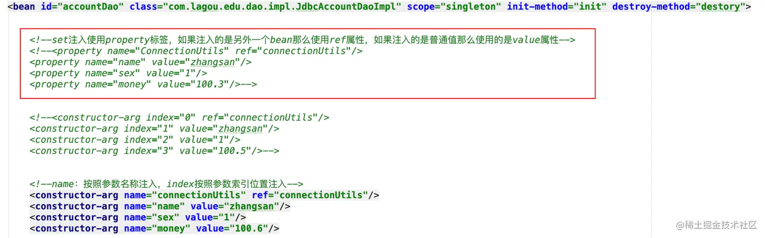 name:指定注入时调用的set方法名称。(注:不包含set这三个字母,druid连接池指定属性名称)