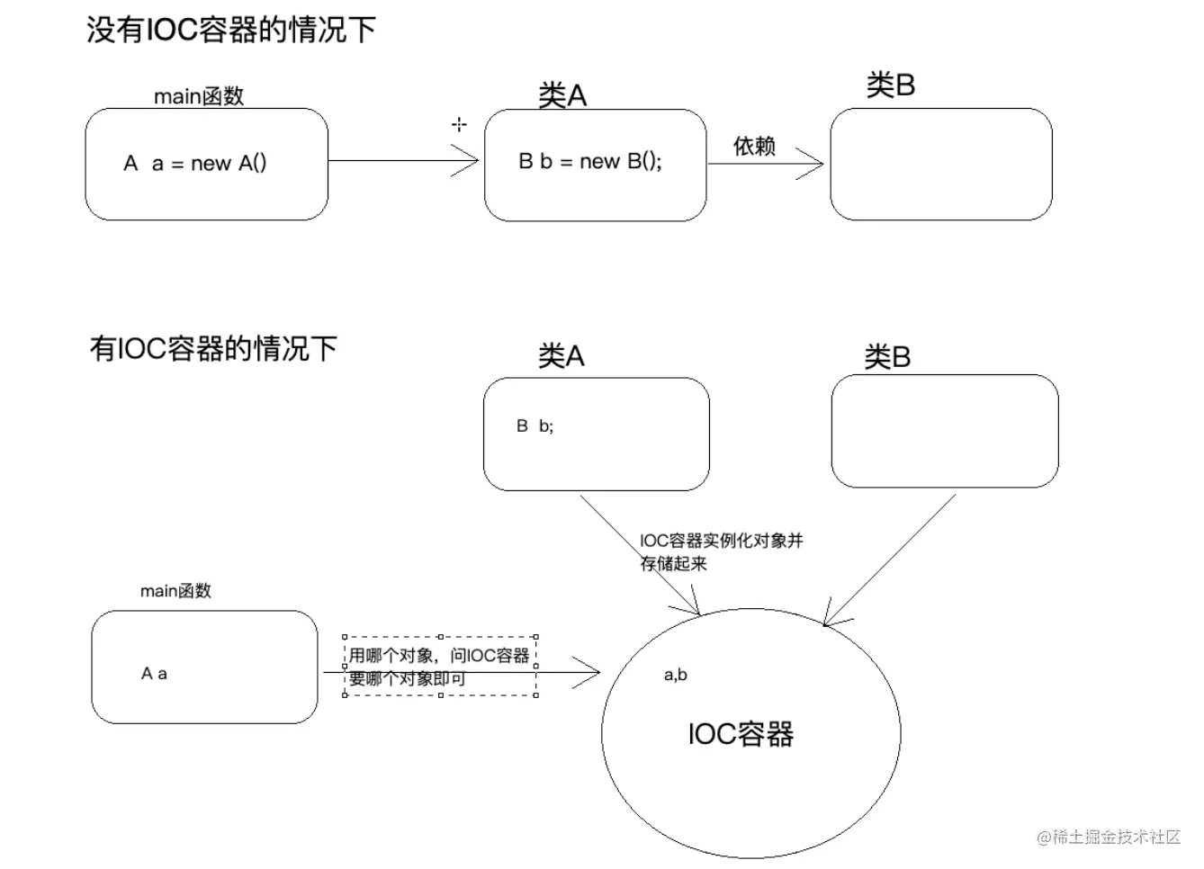 角度不一样,控制反转是指对象实例化及其管理的权利交给了IOC容器