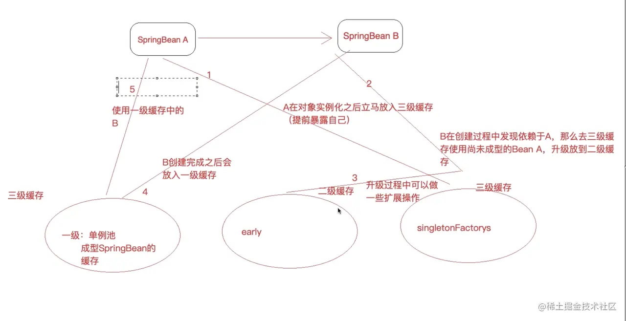 然后为B对象注入属性A,通过getBean(A)从三级缓存中获取A的半成品对象的引用,将A从三级缓存移入二级缓存。并将它做为属性注入B对象