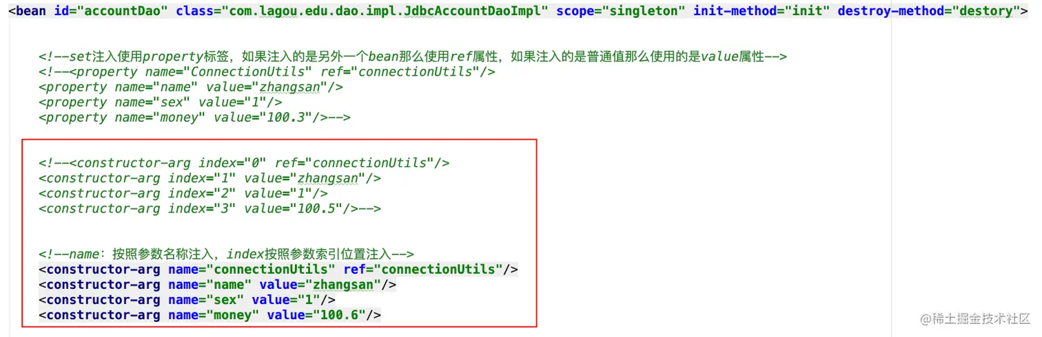 在使用构造函数注入时,涉及的标签是 constructor-arg ,该标签有如下属性: