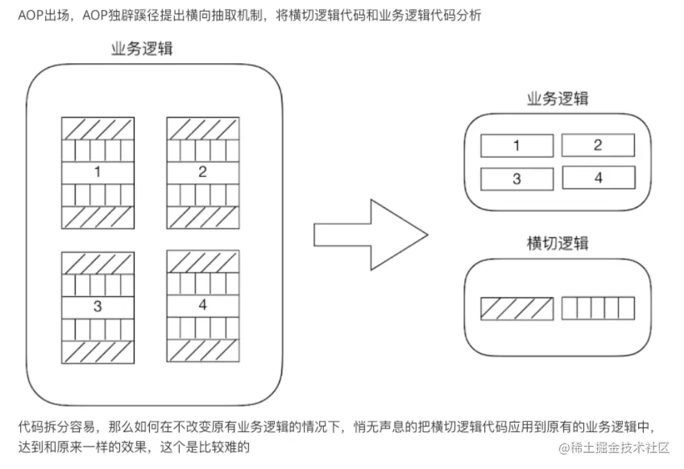 在不改变原有业务逻辑代码外,增强横切逻辑代码,根本上解耦合