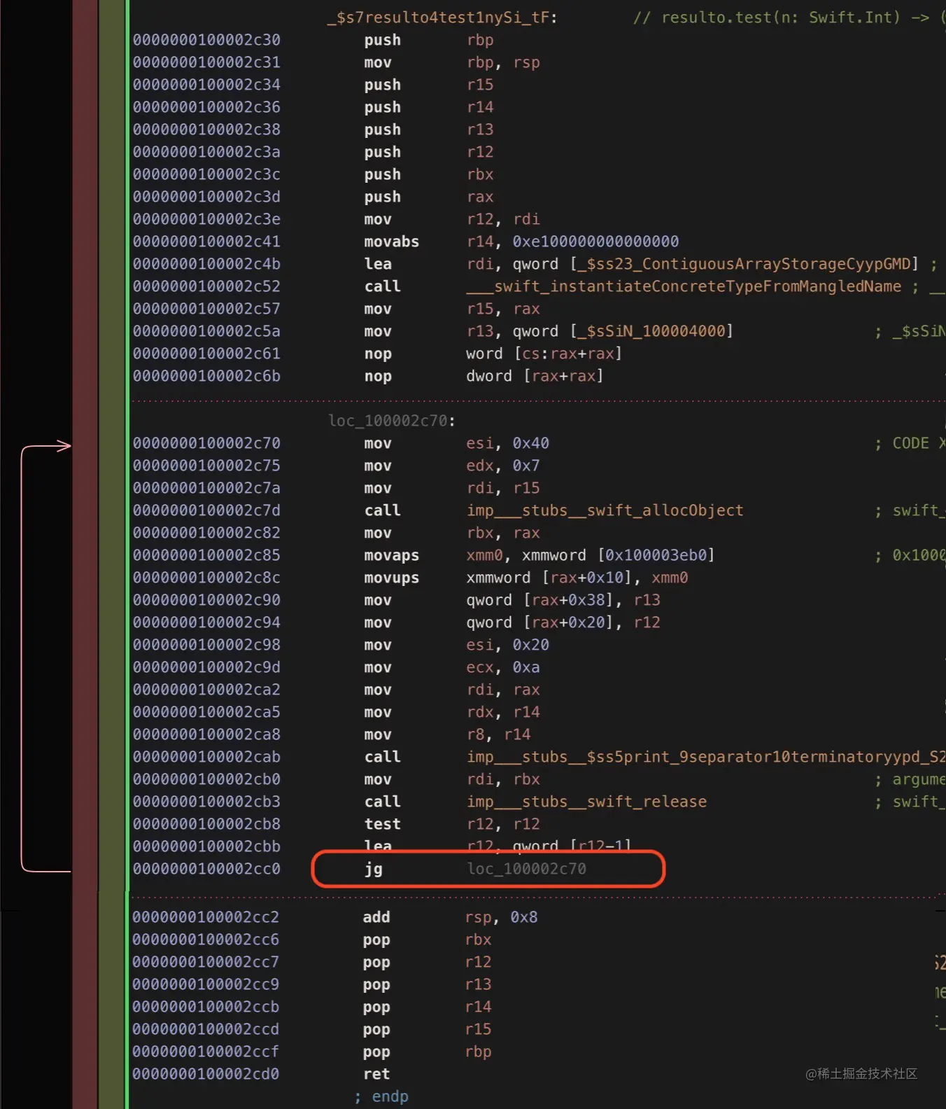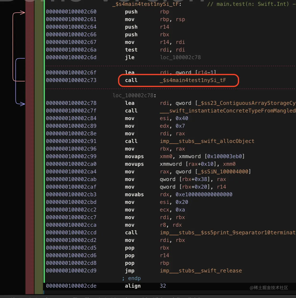 带有递归函数的程序所产生的汇编代码,如下图所示。我们可以看到,在_$s4main4test2nySi_tF的方法中,有一个对iself的方法调用。