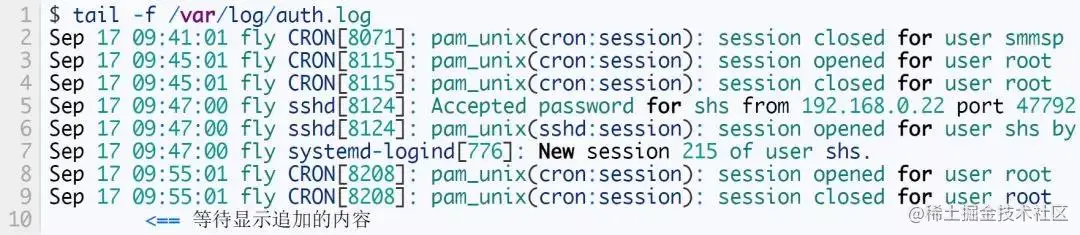 使用形如 tail -f /var/log/syslog 的命令可以查看指定的日志文件,并动态显示文件中增加的内容,需要监控向日志文件中追加内容的的事件时相当有用。这个命令会输出文件内容的末尾部分,并逐渐显示新增的内容。