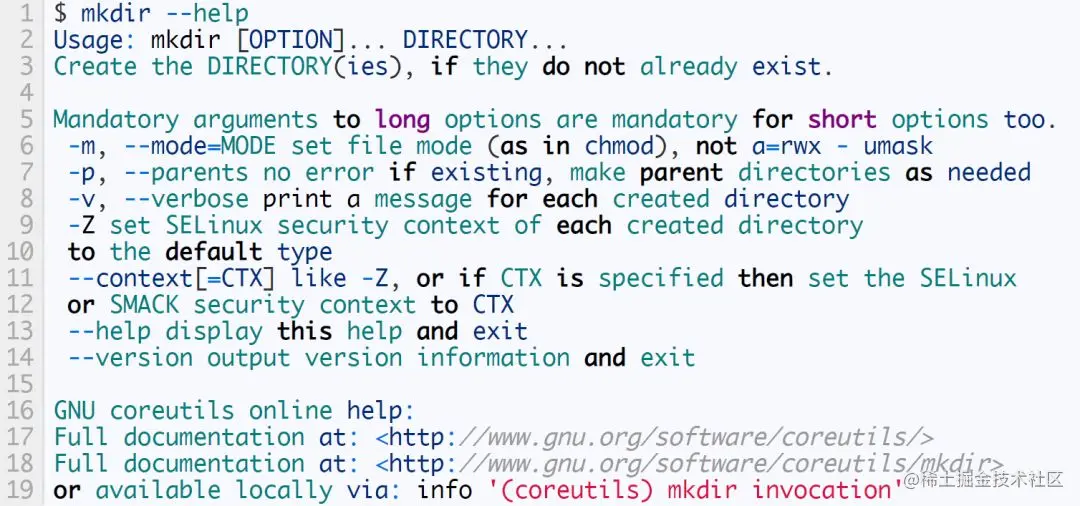 对于大多数 Linux 命令,都可以通过在输入命令后加上选项 --help 来获得这个命令的作用、用法以及它的一些相关信息。除了 man 命令之外, --help 选项可以让你在不使用所有扩展选项的情况下获取到所需要的内容。