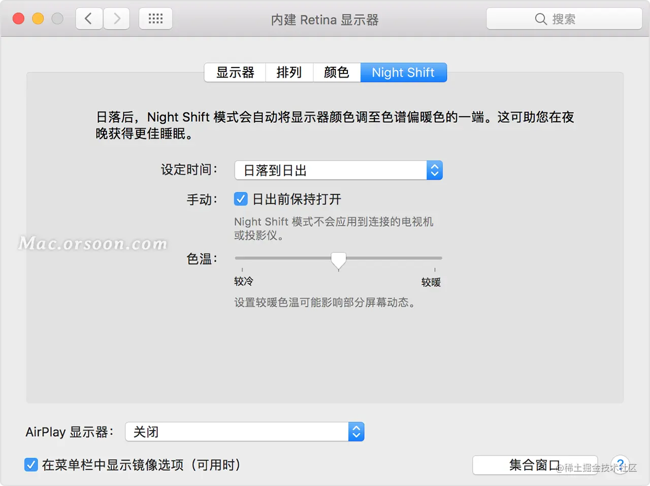 色温:拖动滑块来调整夜览开启时的色温冷暖度。较暖的色温会显示更多的黄色和更少的蓝色。