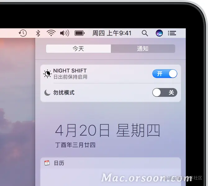 您也可以通过“通知中心”来控制“手动”设置。点按菜单栏中的“通知中心”图标,或双指从触控板的右侧向左轻扫。然后向上滚动,以显示夜览设置。