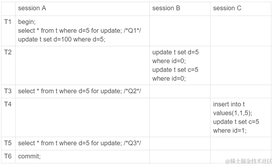 - T6 时刻,session A 事务提交,写入了 update t set d=100 where d=5 这条语句。