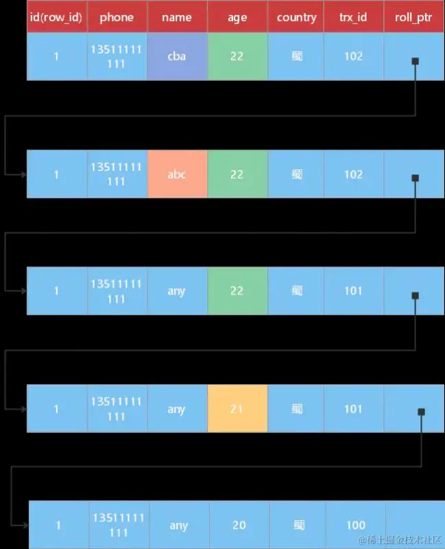 - db_trx_id:6byte,最近修改(修改/插入)事务id:记录创建这条记录/最后一次修改该记录的事务ID。