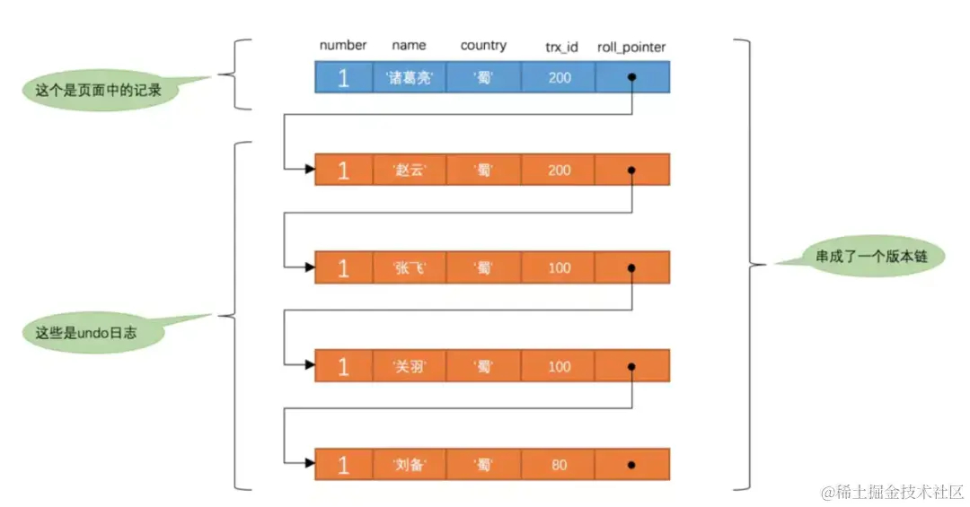 每次对数据库记录进行改动,都会记录一条undo 日志,每条undo日志也都有一个roll pointer属性(INSERT操作对应的undo日志没有该属性,因为该记录并没有更早的版本),可以将这些undo日志都连起来,串成一个链表,所以现在的情况就像下图一样: