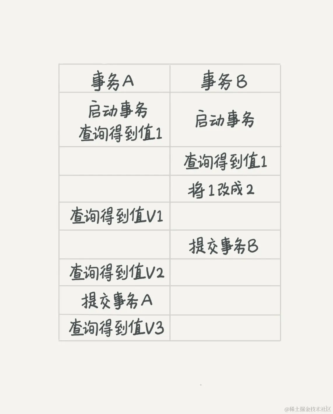 - 可重复读是指,一个事务执行过程中看到的数据,总是跟这个事务在启动时看到的数据是一致的。当然在可重复读隔离级别下,未提交变更对其他事务也是不可见的。