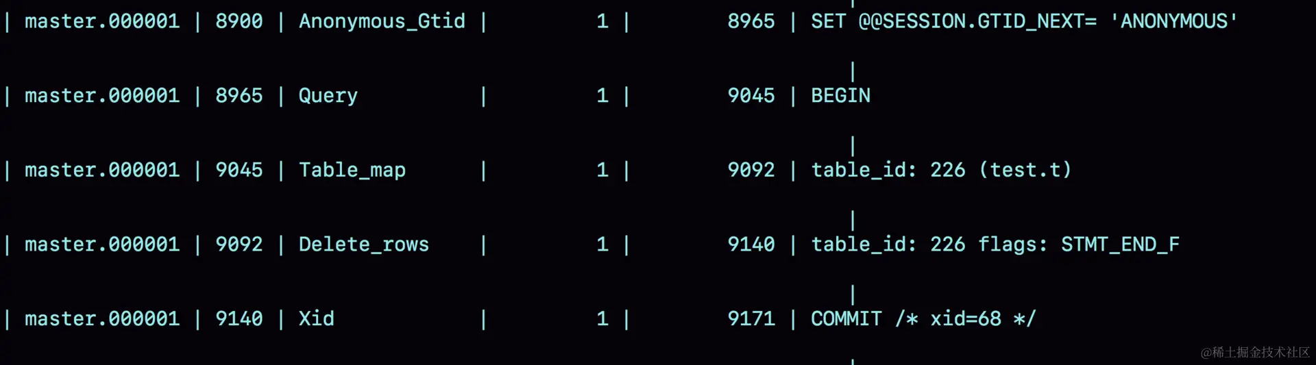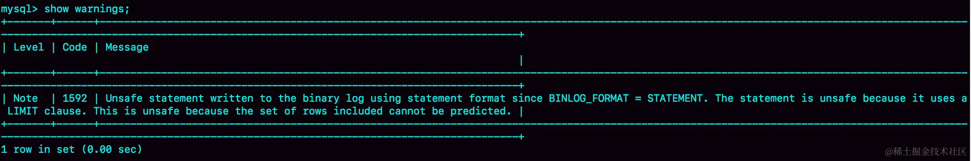 可以看到,运行这条 delete 命令产生了一个 warning,原因是当前 binlog 设置的是 statement 格式,并且语句中有 limit,所以这个命令可能是 unsafe 的。