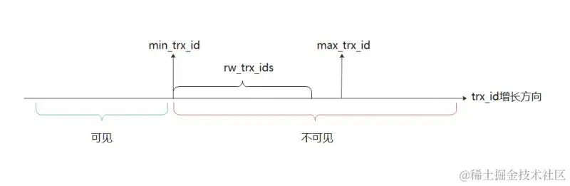 注:max_trx_id并不是rw_trx_ids中的最大值,事务id是递增分配的。比方说现在有id为1,2,3这三个事务,之后id为3的事务提交了。那么一个新的读事务在生成ReadView时,min_trx_id就包括1和2,min_trx_id的值就是1,max_trx_id的值就是4。