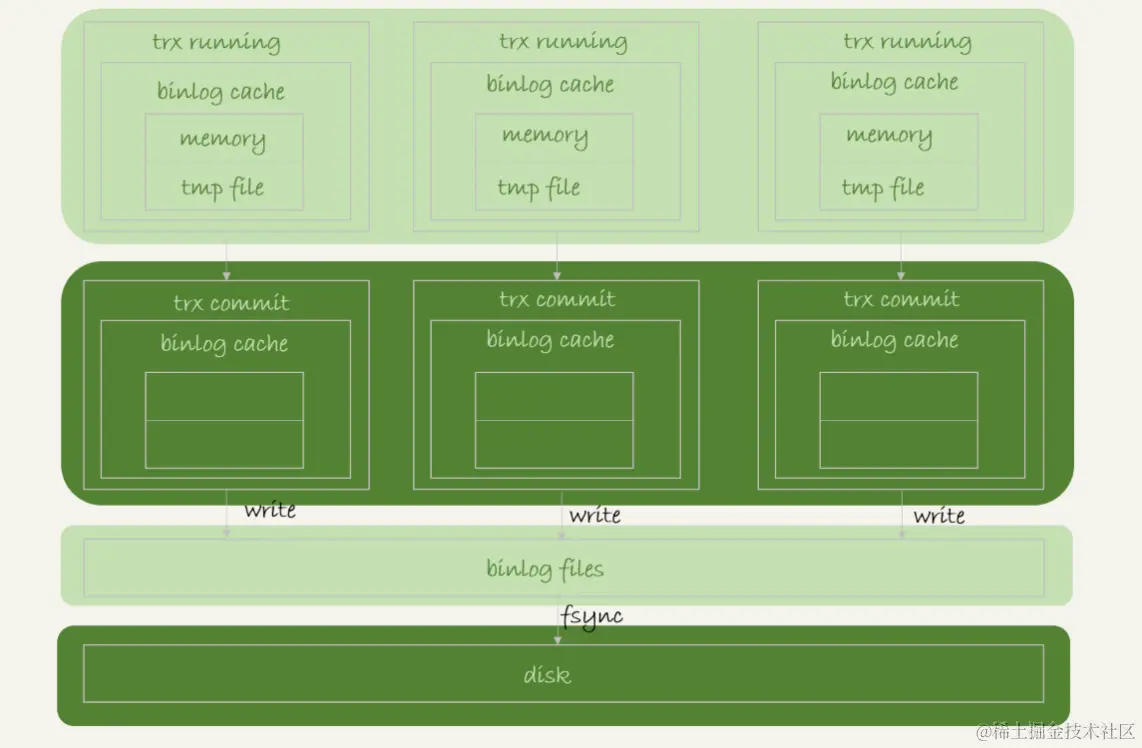 - 写到磁盘 (write),但是没有持久化(fsync),物理上是在文件系统的 page cache 里面,也就是图中的黄色部分;