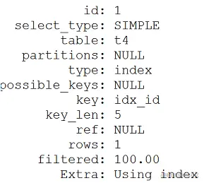 - extra:额外的信息,例如:using file sort ,using where, using join buffer,using index等