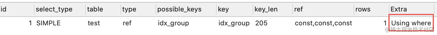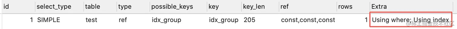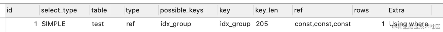 mysql>explain select a,b from test where a = 1 and b = 123 and c = 't';