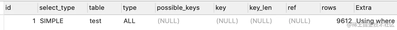 mysql>explain select * from test where a = 1 and b = 123 and c = 't';
