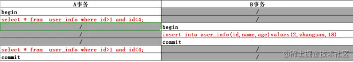 间隙锁作用:防止幻读问题,事务并发的时候,如果没有间隙锁,就会发生如下图的问题,在同一个事务里,A事务的两次查询出的结果会不一样。