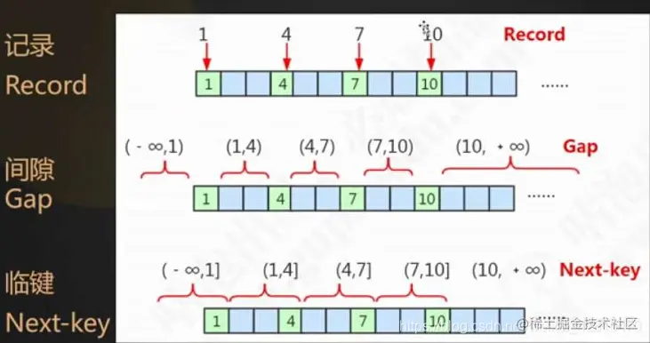 比如下面的表里面的数据ID 为 1,4,5,7,10 ,那么会形成以下几个间隙区间, (-∞,1)、(1,4)、(7,10)(10,+∞)