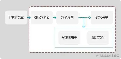 在PC客户端安装的过程中,流程一般是这样的:①运行安装包②弹出安装界面提供给用户操作③执行安装过程-写注册表、启动项、计划任务等④执行安装过程-创建安装的文件夹(③和④可以交换)。