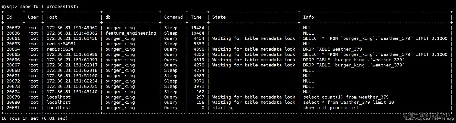 场景: 同事要删除一张表,数据量3308条,数据量不大,但drop表,一直卡着。。。。。。