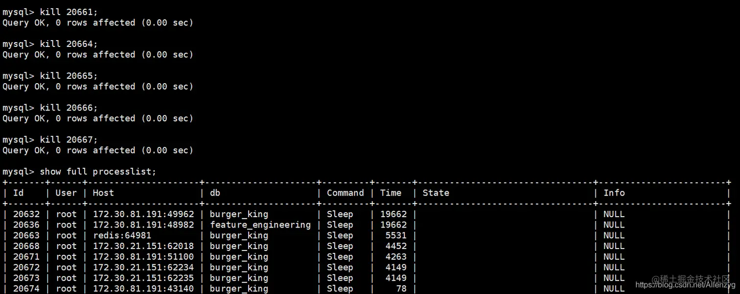 3.使用 kill 将所有的 id 杀死。然后重启MySQL,一般就会解决了。