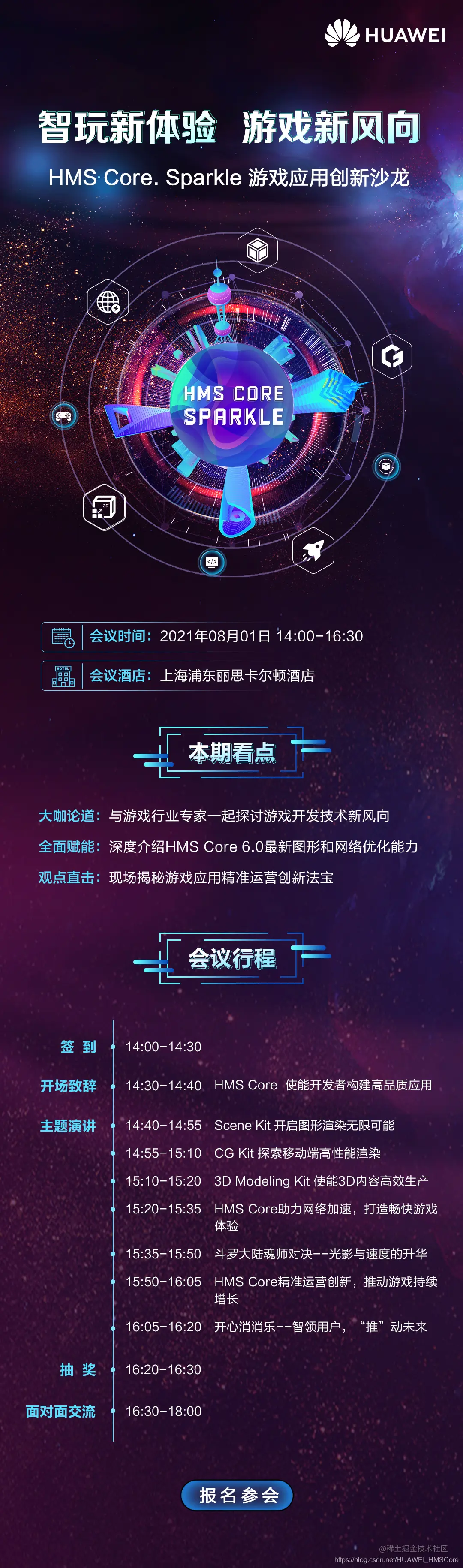面向游戏领域,HMS Core. Sparkle游戏应用创新沙龙将于2021年 8月1日在上海举办。本次沙龙以“智玩新体验 游戏新风向”为主题,围绕3D图形、网络加速、精准运营等话题与众多游戏行业伙伴进行交流,共同探讨技术驱动下的游戏创新,助力游戏行业提升开发和运营效率。此外,华为还将介绍HMS生态及HMS Core开放能力进展,期待与更多合作伙伴同行,实现生态共赢。