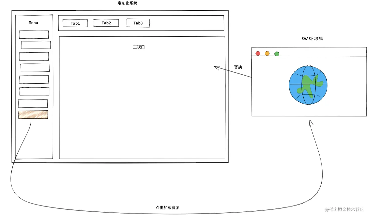 说干就干,我简单理了下思路,打算把定制化项目改造成基座项目,SAAS 项目改造成子项目,当点击侧边栏的一个模块菜单时,把主操作区切换到子项目
