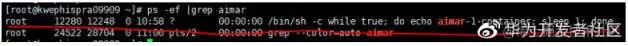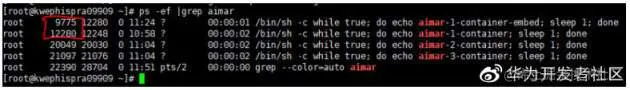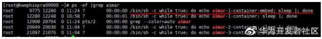 aimar-1-container 容器启动成功后,我们在宿主机上使用 ps 进行查看。这时可以发现刚才启动的容器就是个进程,PID 为 12280。