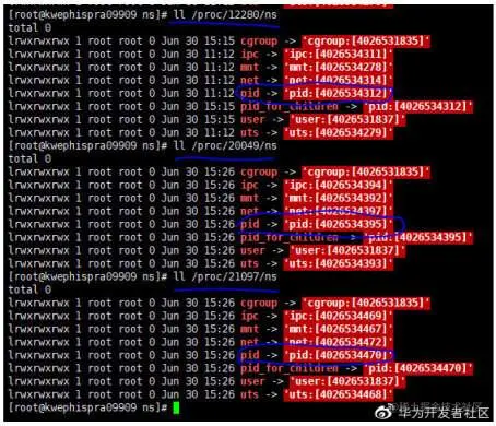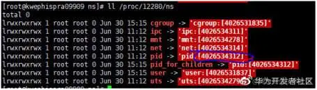前面提到的容器内外,看到的进程 ID 不同,正是使用了 PID Namespace。那么这个 Namespace 在哪呢?在 Linux 上一切皆文件。是的,这个 Namespace 就在文件里。在宿主机上的 proc 文件中(/proc/进程号/ns)变记录了某个进程对应的 Namespace 信息。如下图,其中的数字(例如:pid:[4026534312])则表示一个 Namespace。
