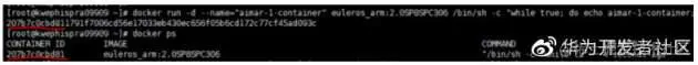 这是 Docker 的标准命令。意思是使用 euleros_arm:2.0SP8SPC306 镜像(镜像名:版本号)创建一个新的名字为"aimar-1-container"的容器,并在容器中执行 shell 命令:每秒打印一次“aimar-1-container”。