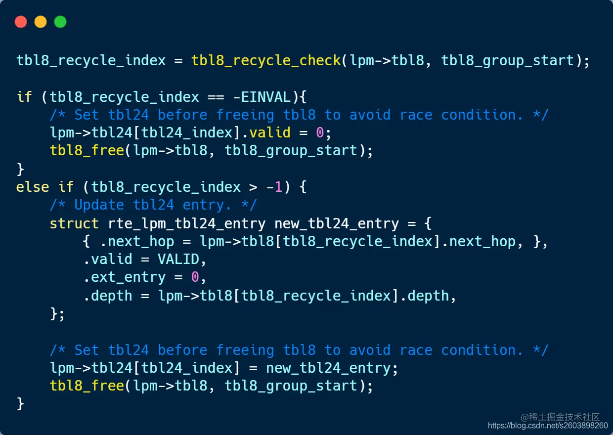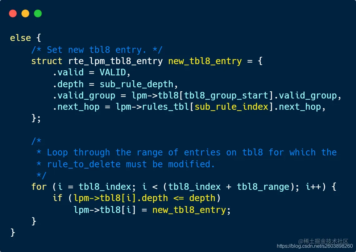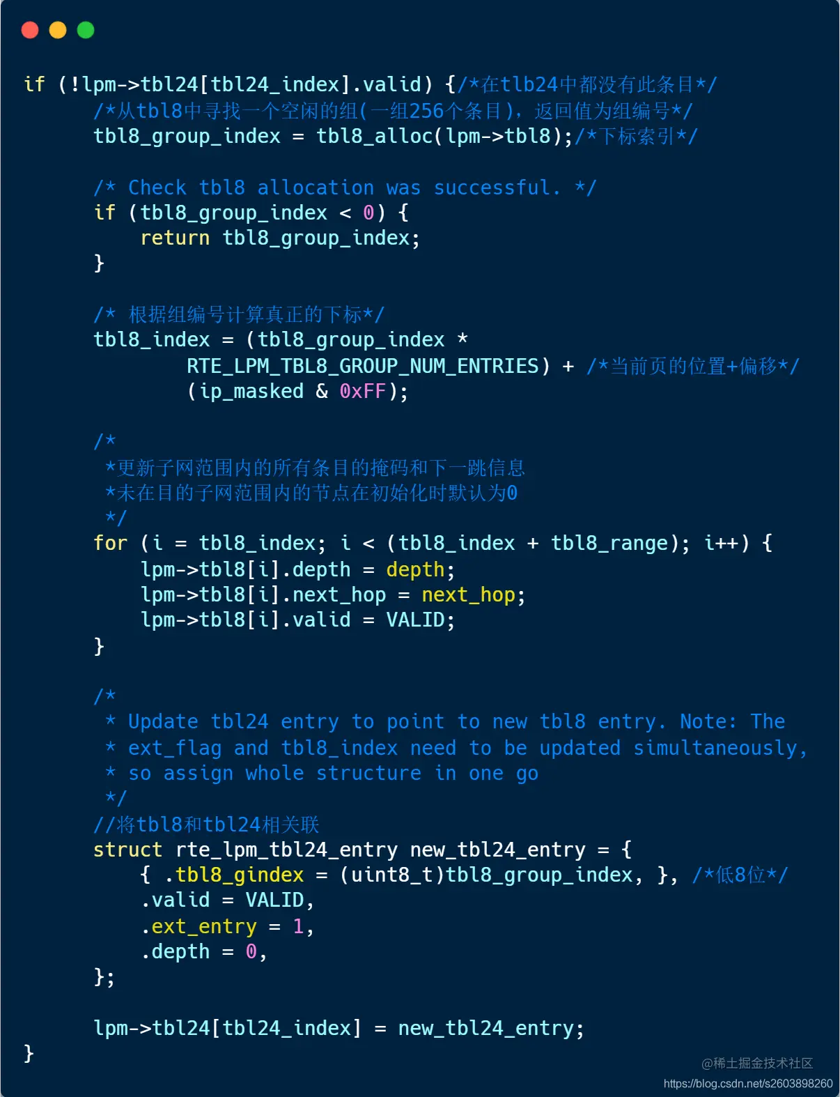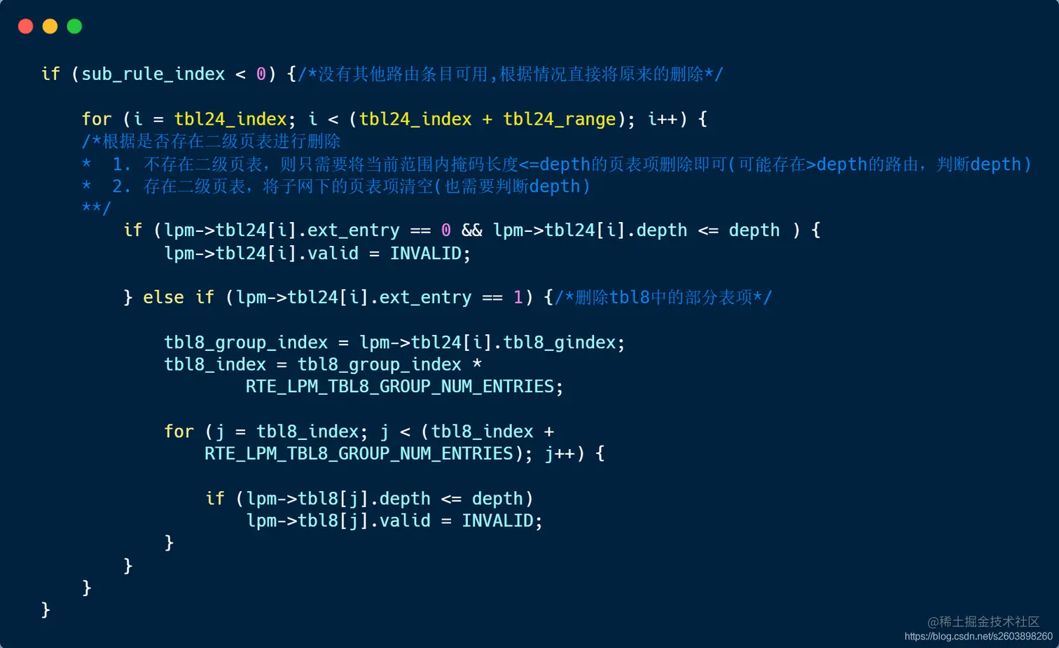 首先是获取IP的高24位, 从而可以根据索引直接找到tbl24中的对应项。由于添加的路由子网掩码可能小于24, 例如:192.168.32.0/20, 它在tbl24表中存在多个表项(掩码越短,对应的条目越多),因此需要将涉及的子网都进行修改。