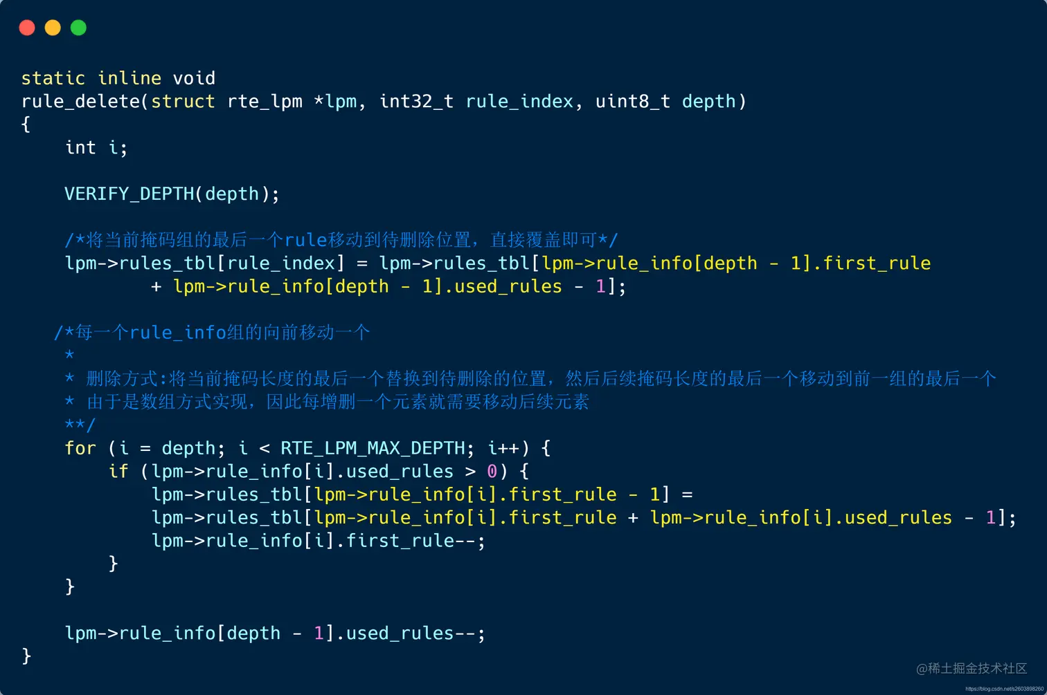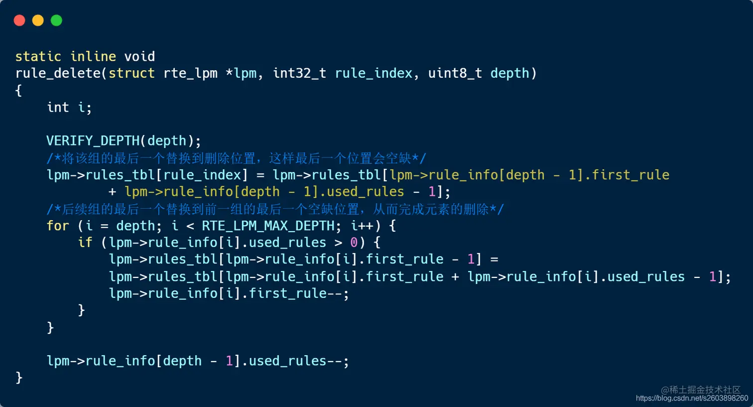 由于rule是通过数组来维护存储的**(有点类似链表的顺序存储,可以快速查询)**,因此在删除之后需要将后续节点进行移动。但是考虑到大量内存拷贝导致的效率低下问题,dpdk采用了有限个元素移动:因为每次只删除一个rule,后续每一个rule组只需向前移动一个节点即可,无需全部移动。明白了这个原则,看代码就会容易很多