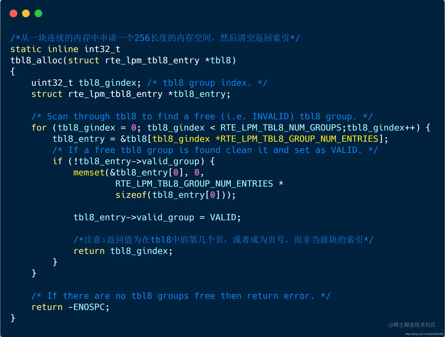 此接口用来从连续的内存中申请一个tbl8表空间。