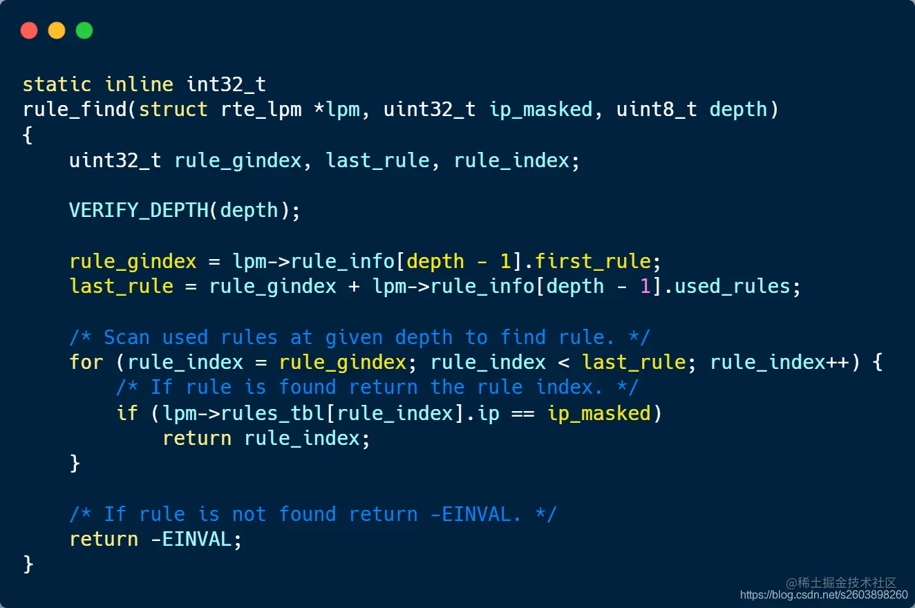 rule_find函数实现比较简单,它首先根据掩码长度(depth)确定rule所在ruleTable中的位置(first_rule)以及区间范围[first_rule, first_rule+used_rules], 然后遍历此范围内的所有rules,直到找到匹配的新rule(ip_masked相等即匹配成功)。