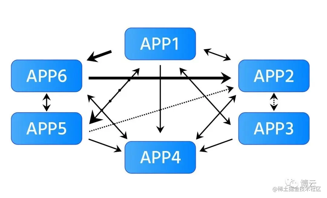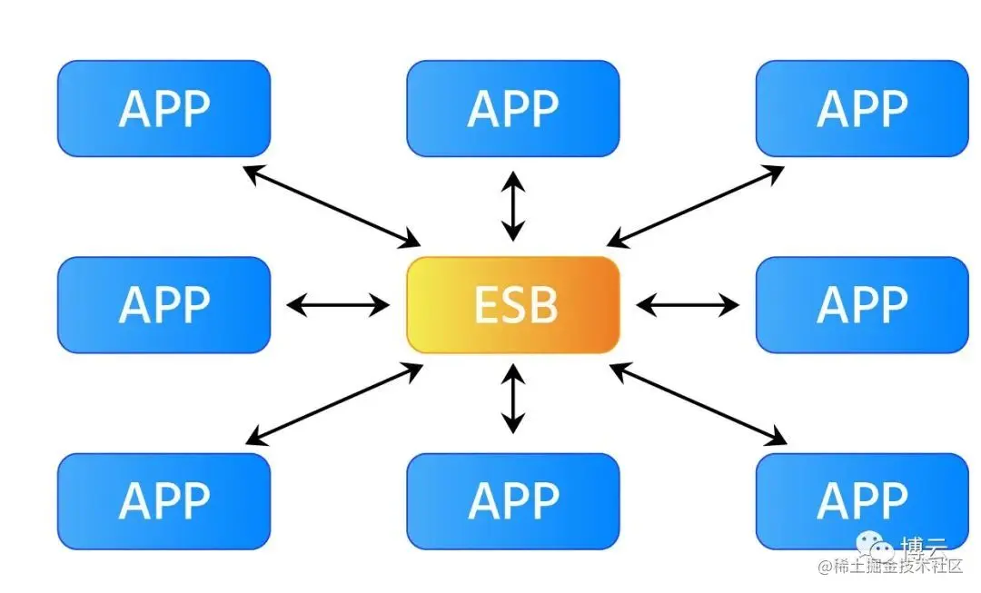 - ESB:企业服务总线,用来连接各个服务节点,服务间通信都通过 ESB 做路由和转发。最主要的是,不同应用可能有不同的协议和报文,ESB 最大的功能是解决不同的服务间互联互通。所以,ESB 其实也算是 SOA 的一种实现形式。