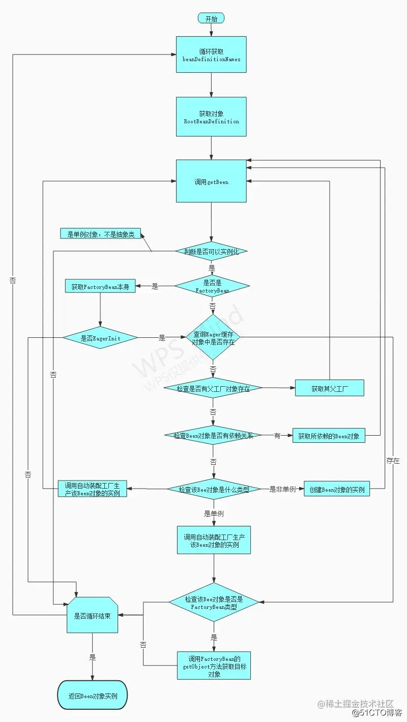 如何创建 Bean 的实例对象以及如何构建 Bean 实例对象之间的关联关系式 Spring 中的一个核心关键,下面是这个过程的流程图。