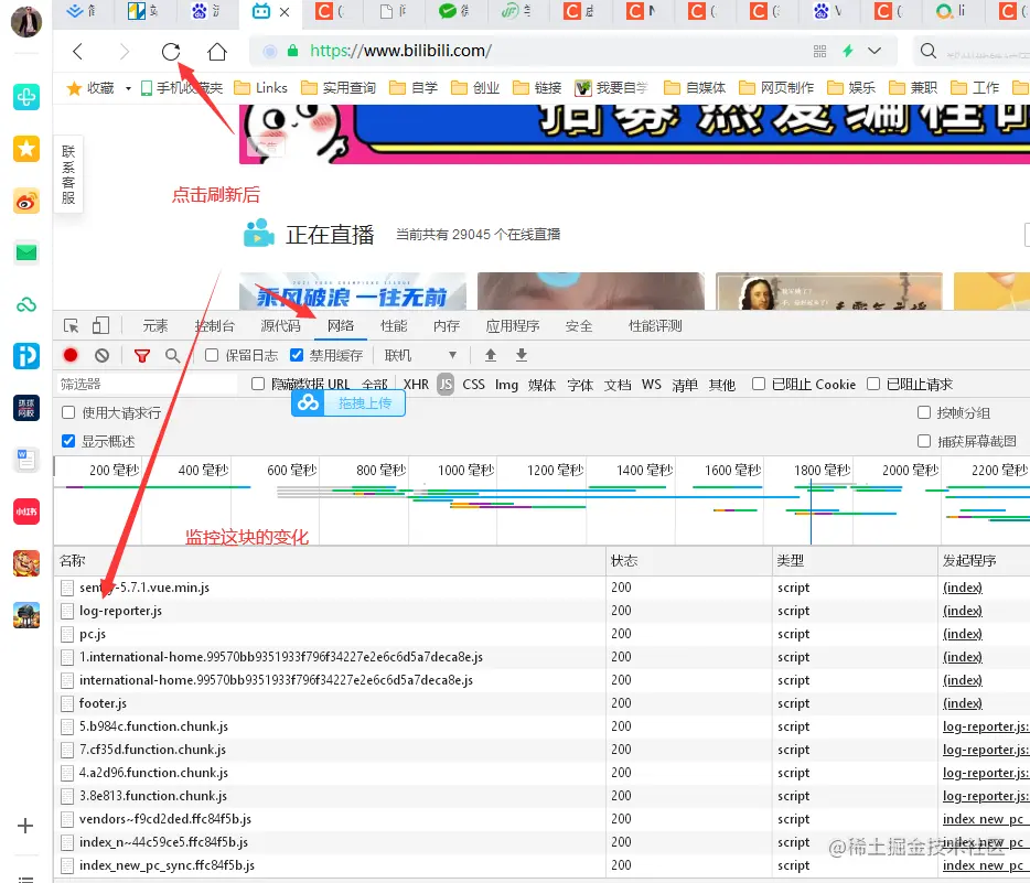 1、先用浏览器打开b站,开发者模式(浏览器开发者模式可以f12打开)进入network面板分析下数据,一般网站都是前后分离的,页面上的动态数据一般都是发送ajax请求后台接口获取到的(当然也有那种提前渲染的,那种不在咱爬取的行列