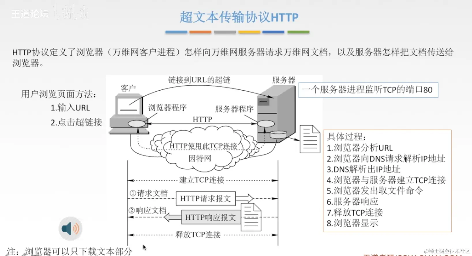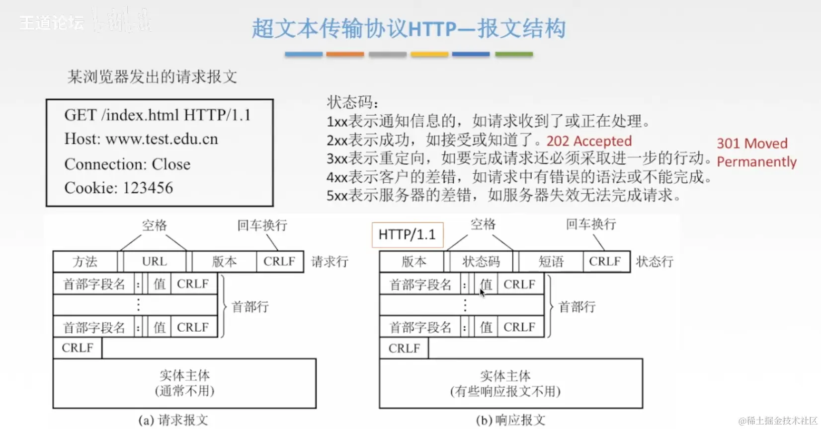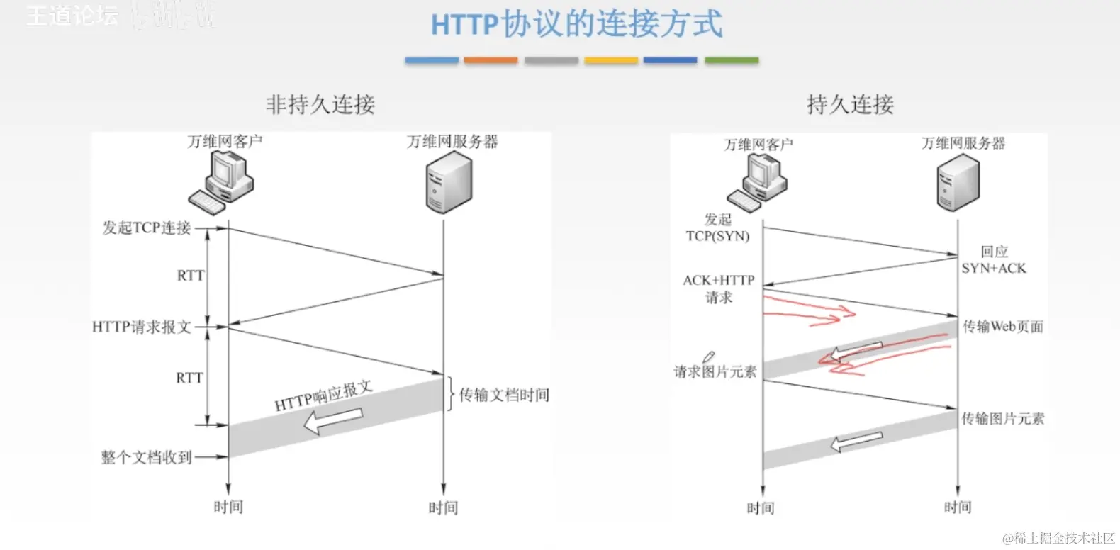王道计算机网络 万维网 草莓味的棉花糖 2021-07-22 203 阅读1分钟 非持久连接:浪费时间,一次文档传输建立完毕之后,需要再次进行数据传递,就需要重新建立TCP连接 持久连接:在建立连接的前提下,进行数据的传输 流水线,可以多次请求数据,服务器依次返回响应的请求 HTTP报文 分成响应报文 和 请求报文 HTTP的报文是面向文本的,因此在报文中的每一个字段都是一些ASCII码串