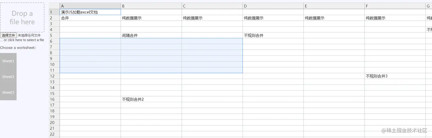 官网的 demo 并没有合并单元格,不过他可以像 excel 一样选中多个单元格,感兴趣的可以去研究一下